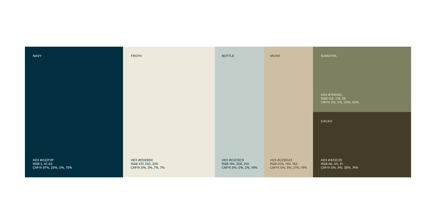 We began by anchoring the brand in its roots. By honouring their original logo illustration and introducing a signature navy paired with organic, earthy tones, we developed a cohesive visual language. The result is a look that feels both grounded and elevated—a reflection of the calm, intentional spirit found in every cup they pour.